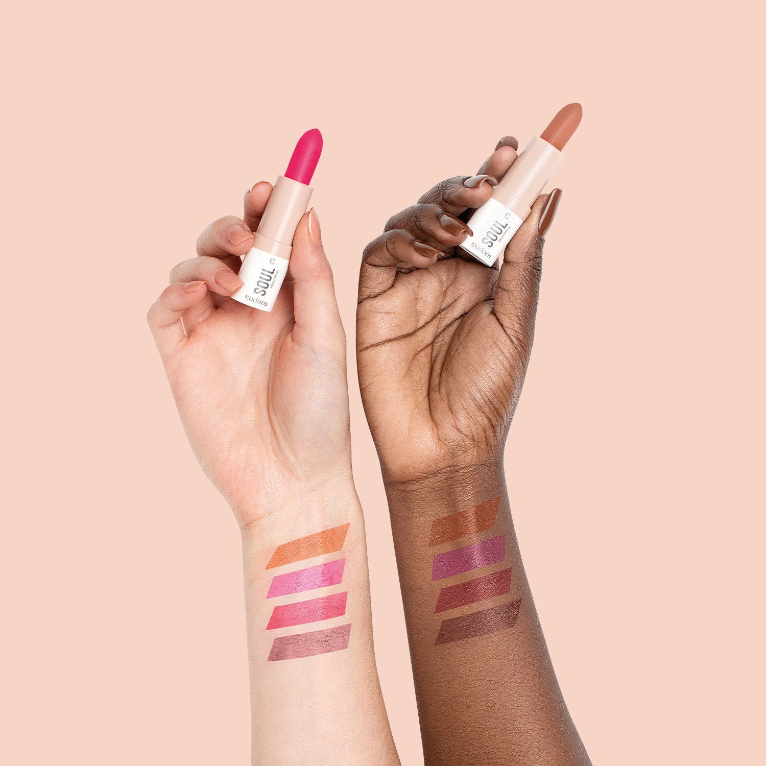 O Batom Efeito Natural Caramelo Sutil Soul Descomplic proporciona cor na medida certa para lábios naturalmente coloridos. Além disso, oferece: