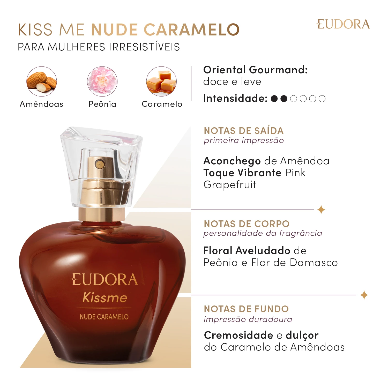 Kiss Me Nude Caramelo Desodorante Colônia é a versão de fragrância feminina da sua cor de batom favorito. Marcante na medida certa, assim como o batom Kiss Me nude Caramelo