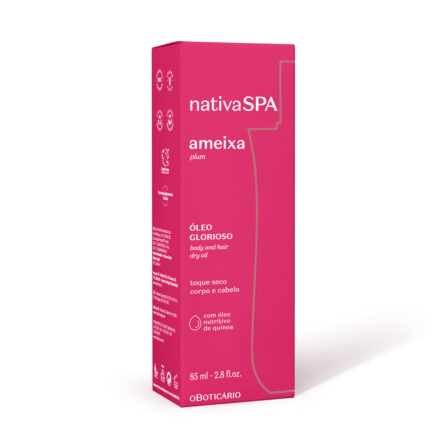 O Óleo Multifuncional Glorioso Nativa SPA Ameixa entrega um produto versátil para sua rotina, com seu tratamento poderoso aliado a uma explosão de fragrância. Sua fórmula incrível em uma textura de óleo seco deixa a pele iluminada e nutrida enquanto aumenta o brilho do cabelo, conferindo maciez e redução da quebra, além de benefícios como: