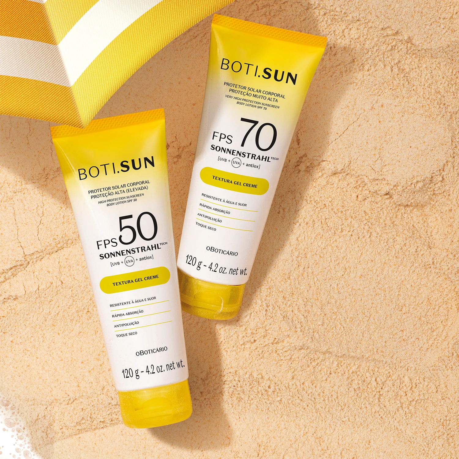 O Protetor Solar Corporal FPS70 Boti.Sun será seu aliado no verão e na etapa de proteção do momento de autocuidado, ajudando a prevenir queimaduras solares, vermelhidão e o envelhecimento causado pela exposição solar.