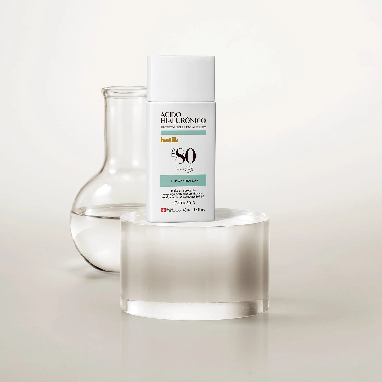 O Protetor Solar Facial Fluido FPS 80 Botik Ácido Hialurônico é o último passo da sua rotina de skincare diurna, oferecendo proteção solar e tratamento para a pele. Sua fórmula com Ácido Hialurônico foi especialmente desenvolvida para proteger, hidratar, prevenir o envelhecimento precoce e a perda de firmeza da pele.